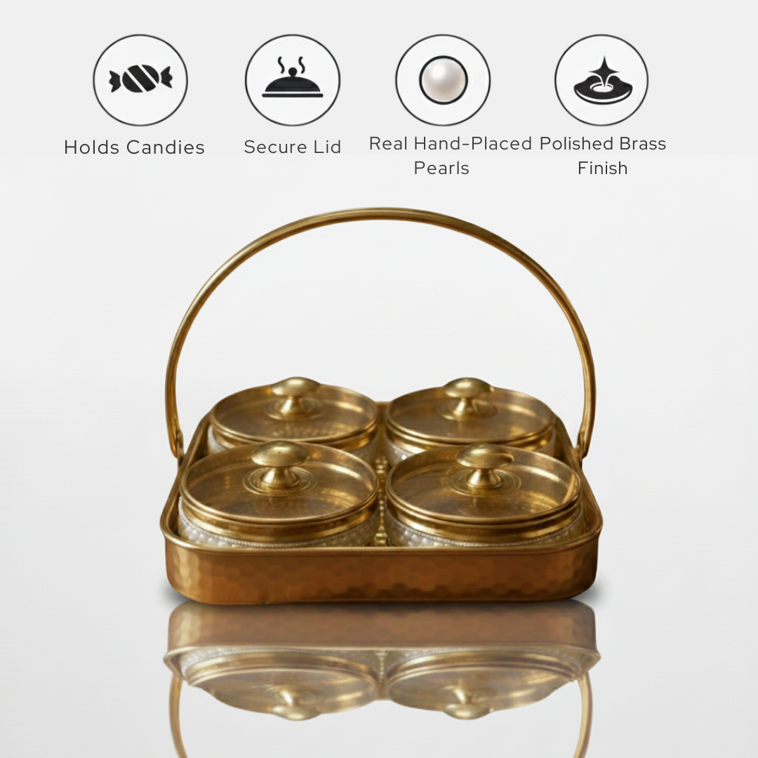 पित्तल कैंडी बाउल सेट जिसमें मोती बॉर्डर के साथ 4 कटोरे और हैंडल के साथ ट्रे है।