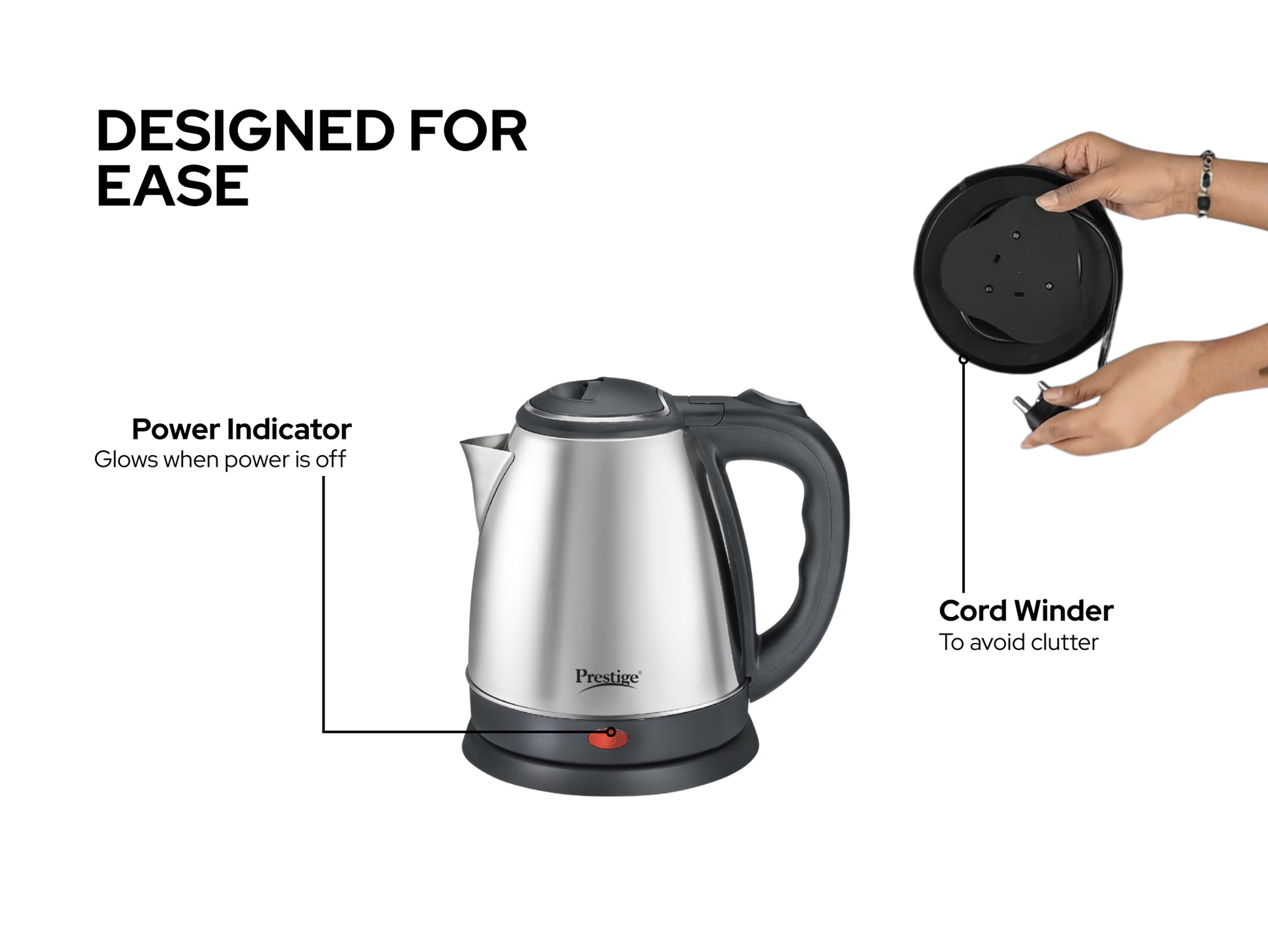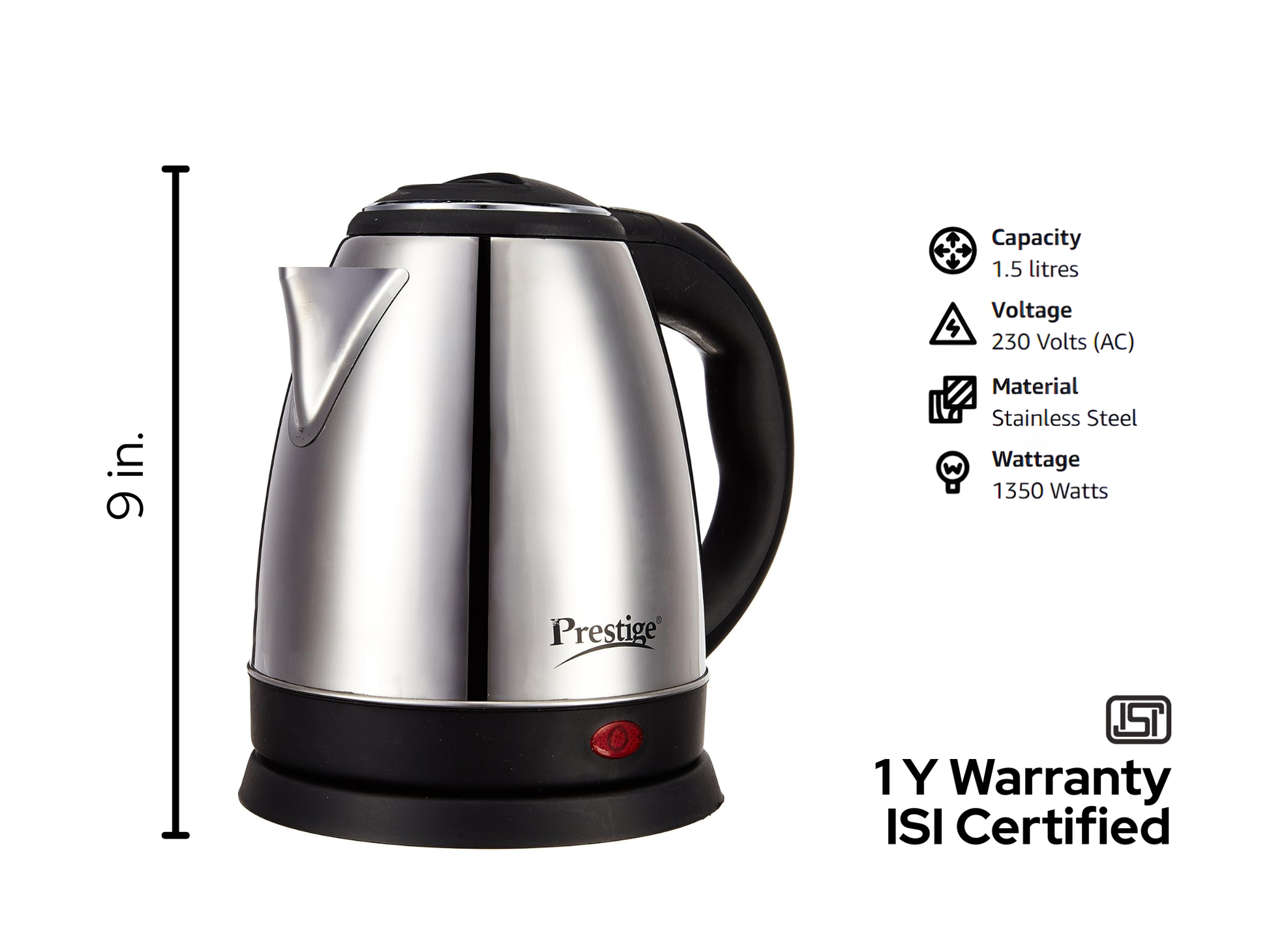प्रेस्टीज पीकेओएसएस स्टेनलेस स्टील इलेक्ट्रिक केटल (1500W) को तेज, कुशल और परेशानी मुक्त उबालने के लिए डिज़ाइन किया गया है।
