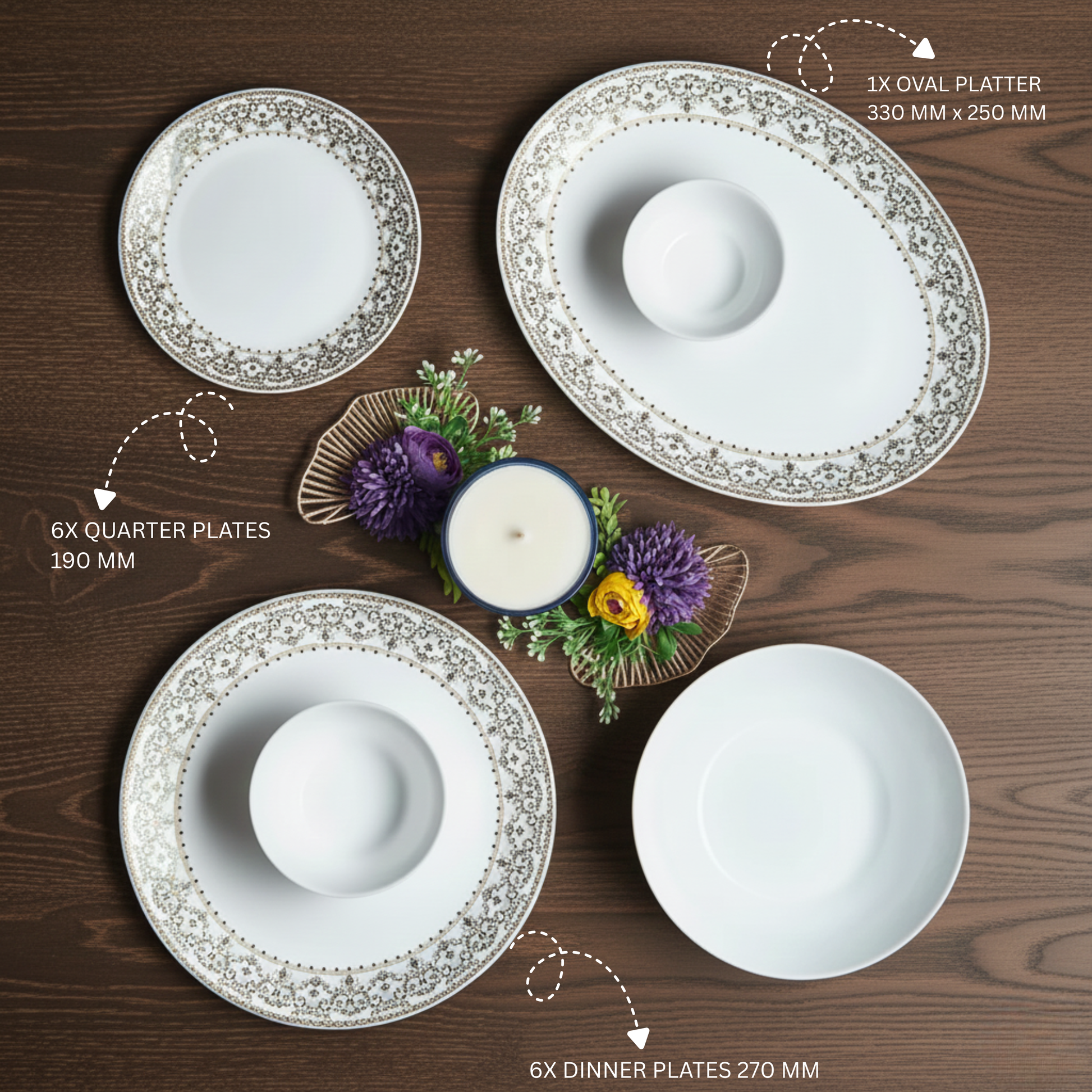 27 Pieces - 6 N Dinner Plates + 6 N Quarter Plates + 2 N Serving Bowls + 6 N Veg Bowls + 6 N Soup Bowls + 1 N Platter 35pieces- 6 N Dinner Plates + 6 N Quarter Plates + 6 N Veg Bowls + 6 N Soup Bowls + 1 N Oval Platter + 2 + 2 N Casserole with lid + 6 N Spoon